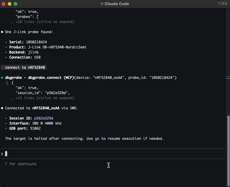Example: Let Claude Code list attached J-Link probes, connect to your nRF52840, flash a new firmware, read memory, and reset the target β all conversationally.